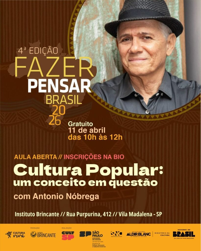 O projeto “Fazer Pensar Brasil” inicia sua programação oficial no próximo sábado, 11 de abril, com uma aula magna ministrada pelo artista e pesquisador Antonio Nóbrega. Sob o título “Cultura popular: um conceito em questão”, a palestra de abertura propõe uma análise crítica e profunda sobre as nomenclaturas e dimensões do que tradicionalmente é classificado como folclore ou cultura popular no território brasileiro.