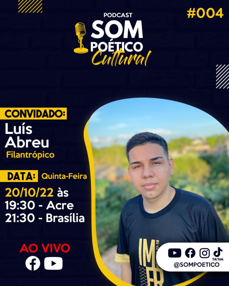 PODCAST: SOM POÉTICO CULTURAL #012 CONVIDADO: LUÍS ABREU ( Filantrópico) https://instagram.com/abreuluis_22?igshid=YmMyMTA2M2Y= DATA: 20/10/2022 – QUINTA-FEIRA