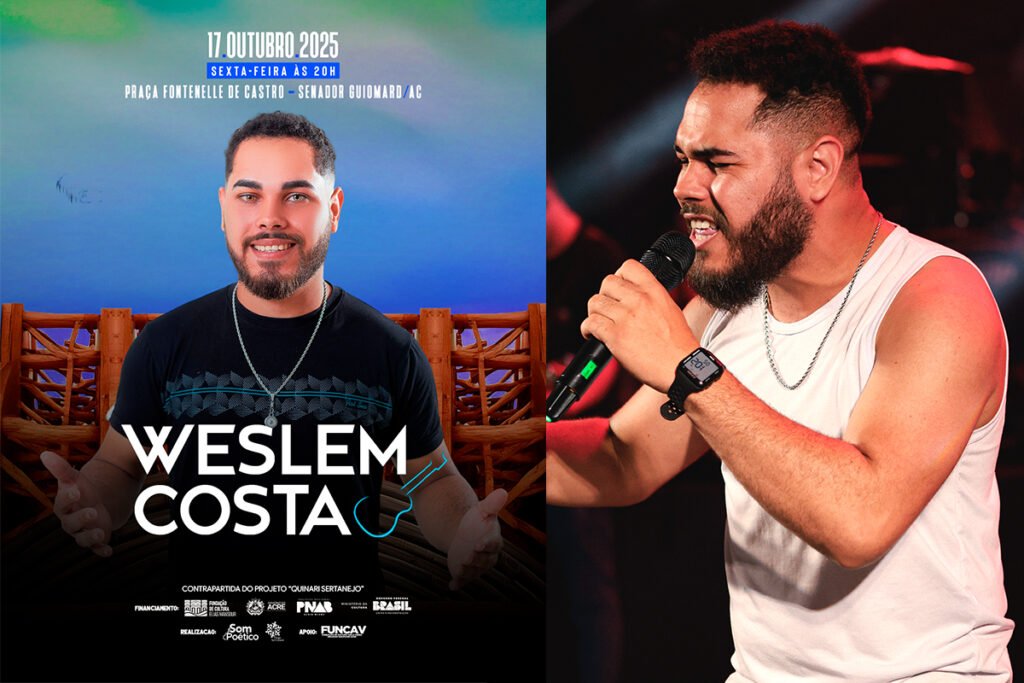 O cantor Weslem Costa se apresenta gratuitamente nesta sexta-feira, 17 de outubro de 2025, a partir das 20 horas, na Praça Fontenelle de Castro, em Senador Guiomard (AC). O evento...