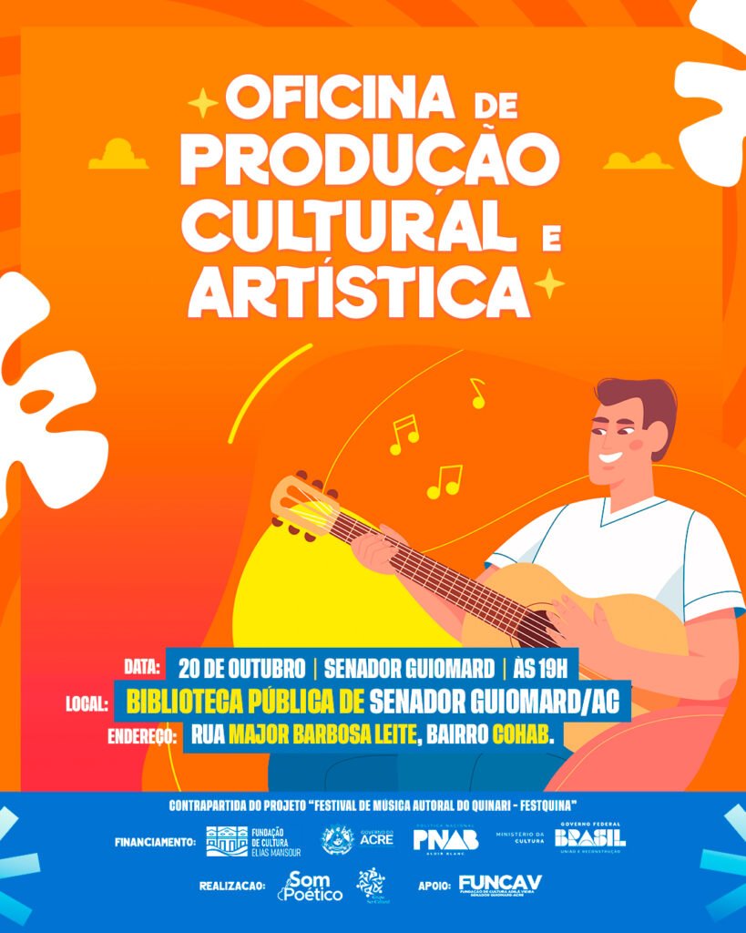 A cidade de Senador Guiomard (AC) recebe, na próxima segunda-feira, 20 de outubro de 2025, às 19 horas, a Oficina de Produção Cultural e Artística, que acontecerá na Biblioteca Pública, localizada na Rua Major Barbosa Leite, Bairro Cohab. A atividade faz parte das ações de contrapartida social do projeto “Festival de Música Autoral do Quinari – FESTQUINA”, iniciativa voltada à valorização da produção musical e ao fortalecimento da cena cultural local.