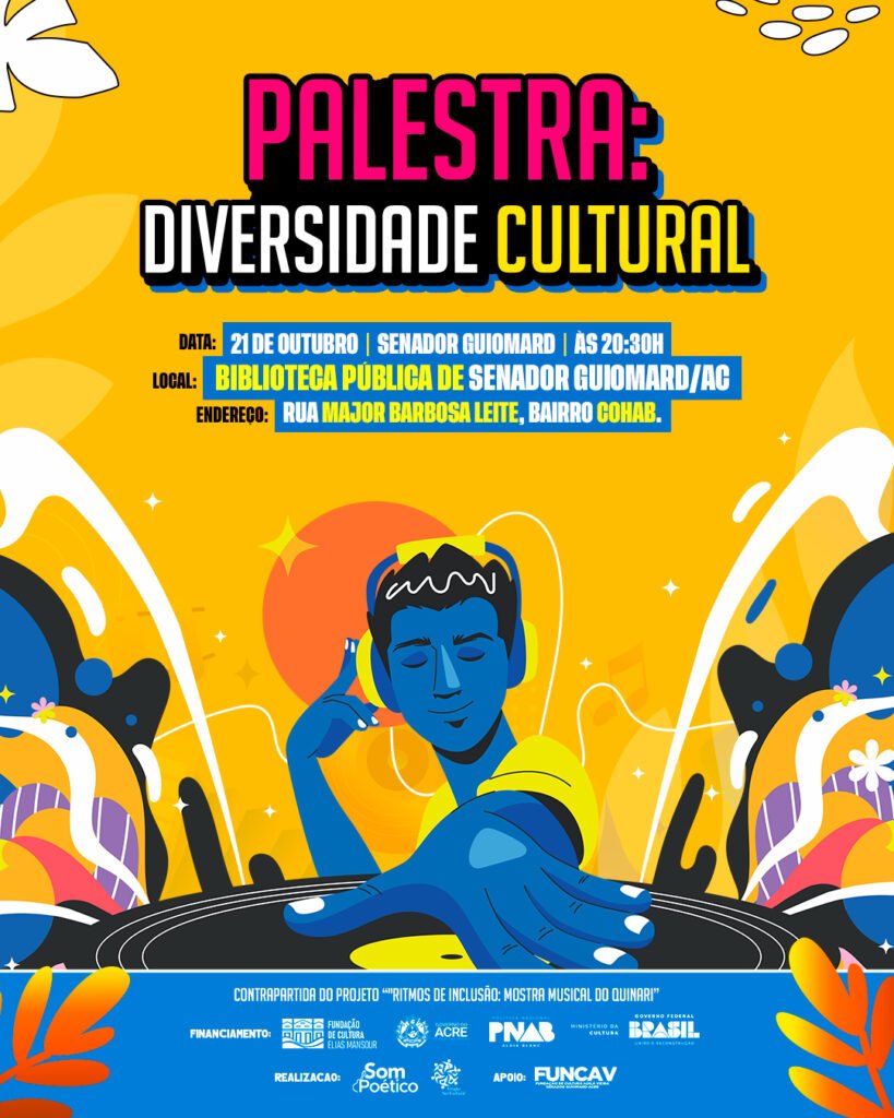 Na próxima terça-feira, 21 de outubro de 2025, às 20h30, a Biblioteca Pública de Senador Guiomard, situada na Rua Major Barbosa Leite, Bairro Cohab, será palco da Palestra “Diversidade Cultural”, uma iniciativa que busca promover o diálogo, o respeito e a valorização das múltiplas expressões artísticas e identitárias presentes na sociedade acreana. A atividade faz parte das ações de contrapartida social do projeto “Ritmos de Inclusão: Mostra Musical do Quinari”, que tem como foco a arte como instrumento de integração e transformação social.